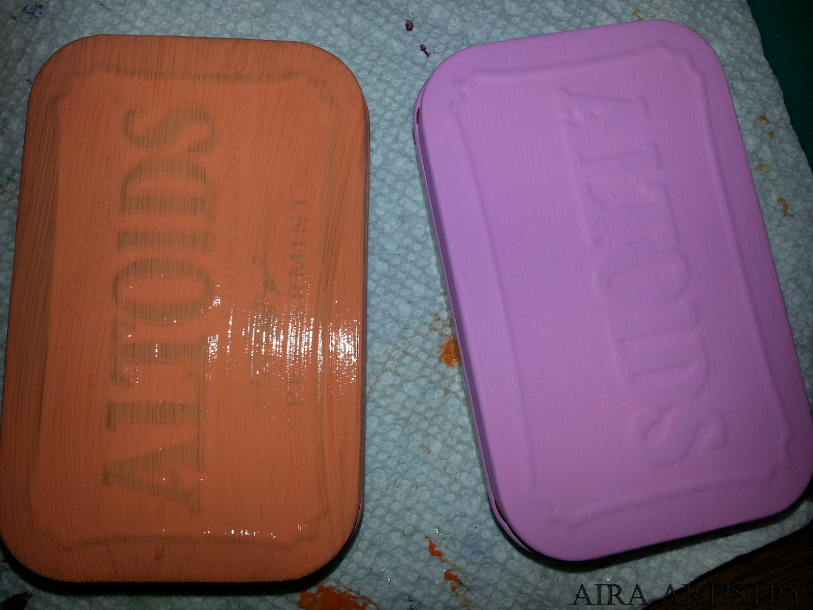 By this point the pink tin had its third coat, and aside from a few minor touch-ups, it was ready to be finished. The orange was on its fourth coat, which was the first coat that I mixed in a drop of peach that I had to it.